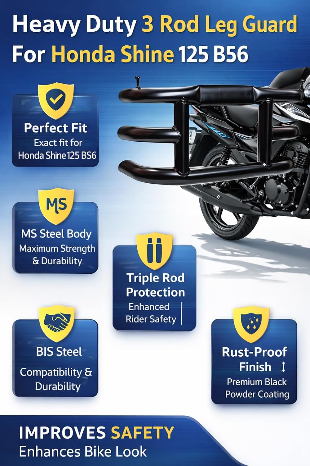 Heavy Duty 3 Rod Leg Guard Compatible with Honda Shine 125 BS6 New | Strong Crash Guard | Premium Bike Safety Guard